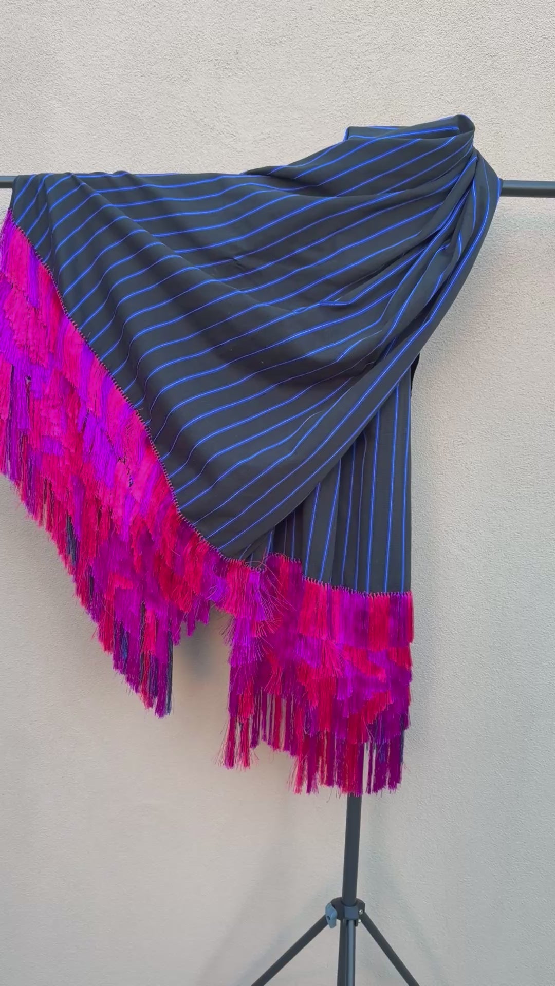 One of the most beautiful Purepecha rebozo’s with fringe from Michoacán, Mexico that I have ever seen. The combination is spectacular. These come from a Purepecha artisan from Michoacan. This is a traditional style of rebozo that has been produced for many years. It is 100% cotton with rayon and with silk fringe and feathers. This is woven on a backstop loom and takes about a month to make. The fringe on each end is called ‘flowers’. All of these Purepecha Rebozo’s measure 2.5 feet by 76 inches long. They are simply fabulous! This artisan is known for her amazing color.