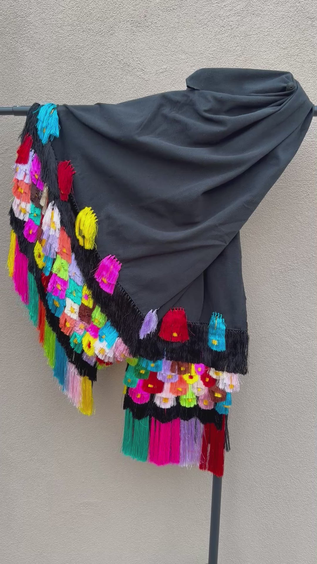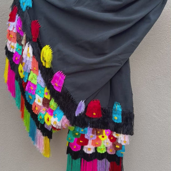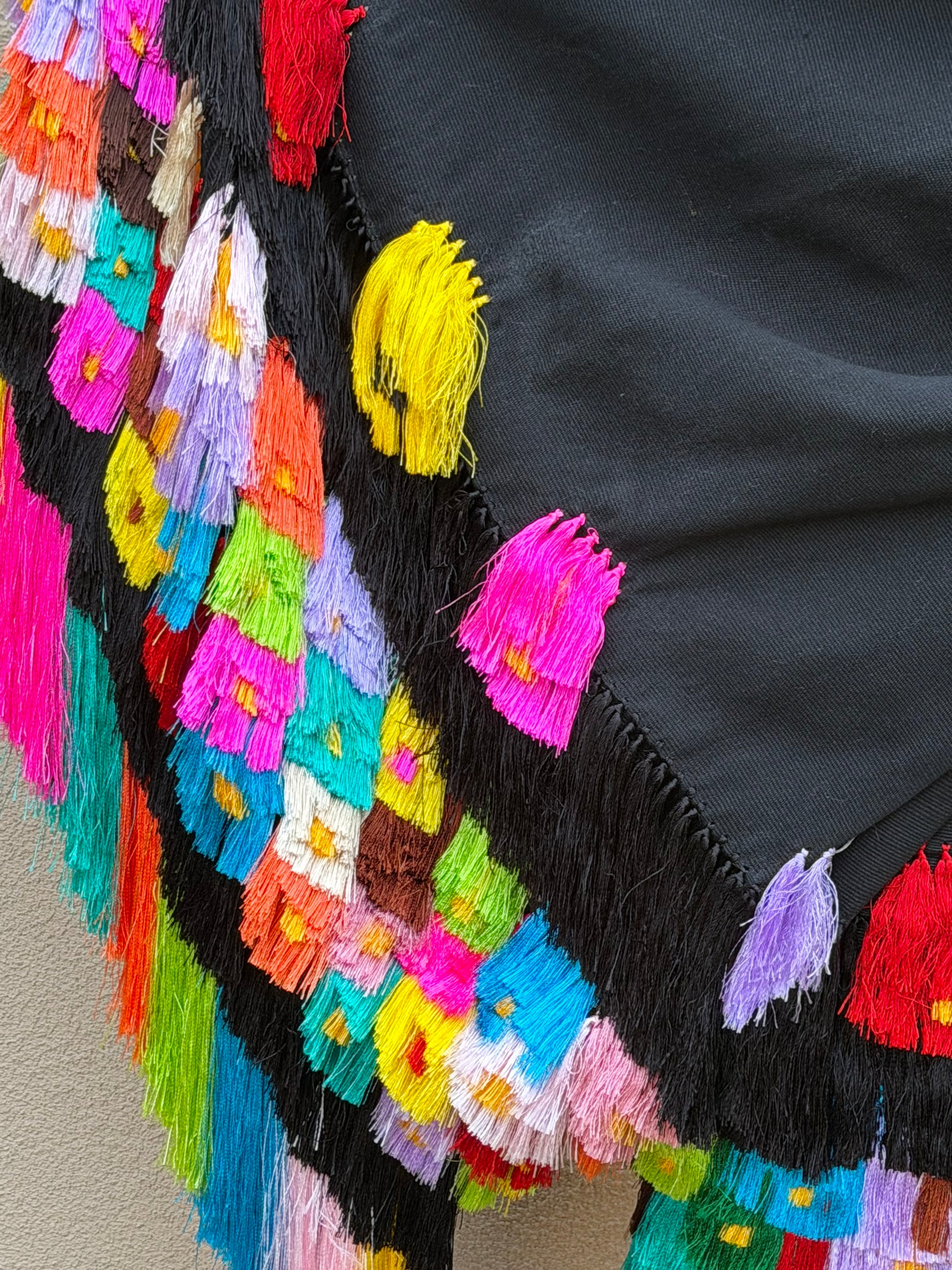 One of the most beautiful Purepecha rebozo’s with fringe from Michoacán, Mexico that I have ever seen. The color combination of this Purepecha Rebozo is spectacular. These come from a Purepecha artisan from Michoacan. This is a traditional style of rebozo that has been produced for many years. It is 100% cotton with rayon and with silk fringe and feathers. This is woven on a backstop loom and takes about a month to make. The fringe on each end is called ‘flowers’. All of these Purepecha Rebozo’s measure 2.5 feet by 76 inches long. They are simply fabulous! This artisan is known for her amazing color.