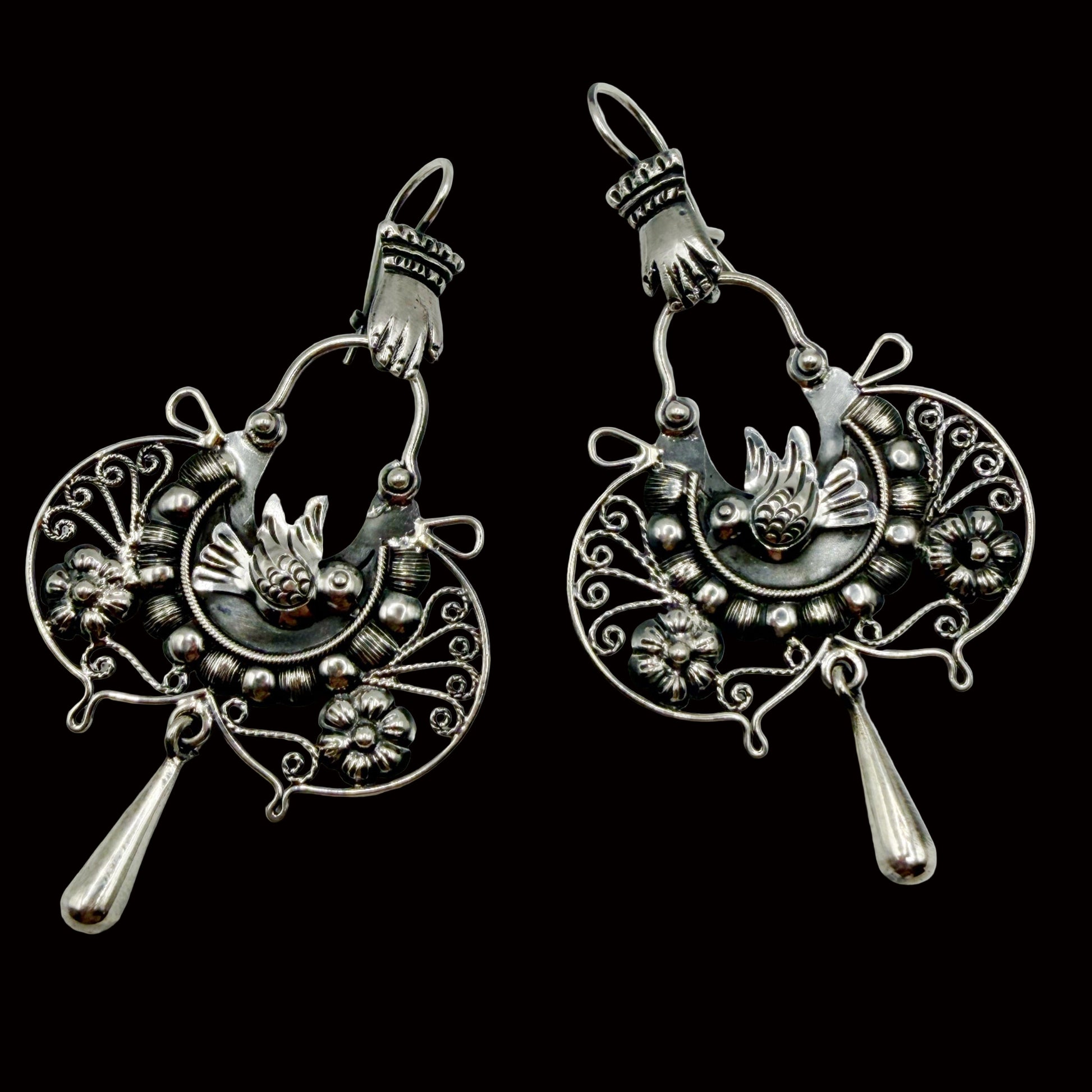 Mexican Mazahua silver dove earrings with hands, handmade, pure silver