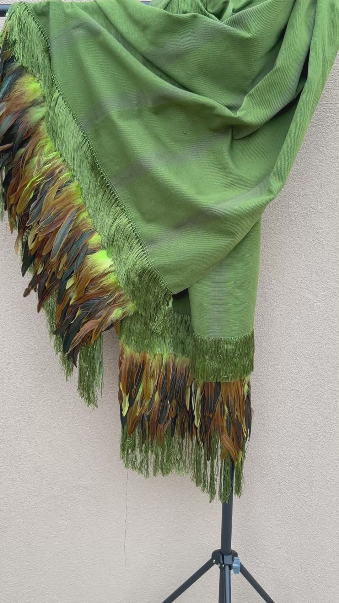 One of the most beautiful Purepecha rebozo’s with fringe from Michoacán, Mexico that I have ever seen. The combination is spectacular. These come from a Purepecha artisan from Michoacan. This is a traditional style of rebozo that has been produced for many years. It is 100% cotton with rayon and with silk fringe and feathers. This is woven on a backstop loom and takes about a month to make. The fringe on each end is called ‘flowers’. All of these Purepecha Rebozo’s measure 2.5 feet by 76 inches long. They are simply fabulous! This artisan is known for her amazing color combinations.