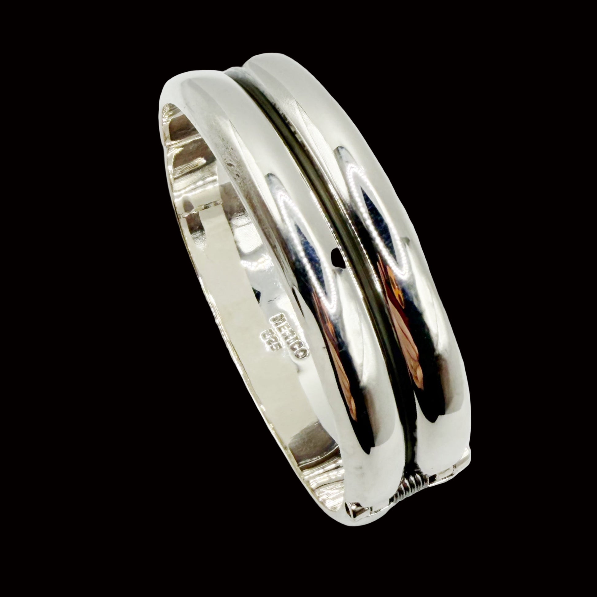 This elegant clamper bracelet showcases the hallmark stripe detailing of Taxco silverwork with a contemporary twist. The hinged clamper design offers effortless on-and-off convenience while maintaining the refined aesthetic of vintage Mexican silver jewelry. Sterling silver dots are precisely arranged across the surface, creating dimensional texture and visual interest. A sophisticated accessory that bridges classic Oaxacan craftsmanship with modern sensibilities, perfect for collectors who value both heritage techniques and current design principles.