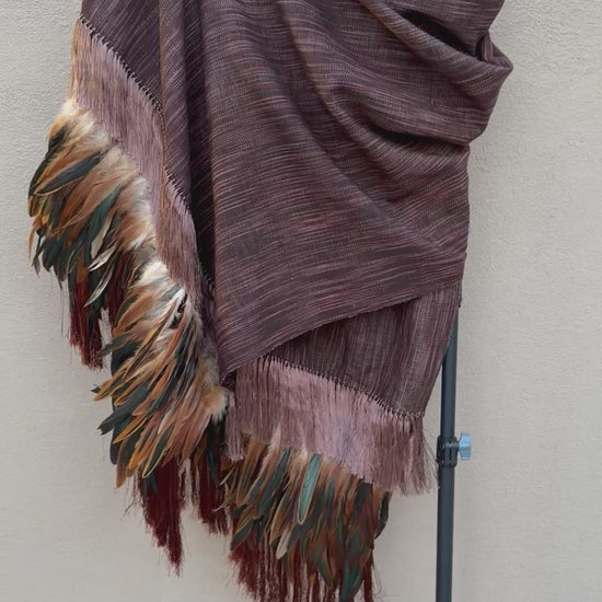 Brown black purepecha rebozo with fringe and feathers