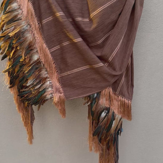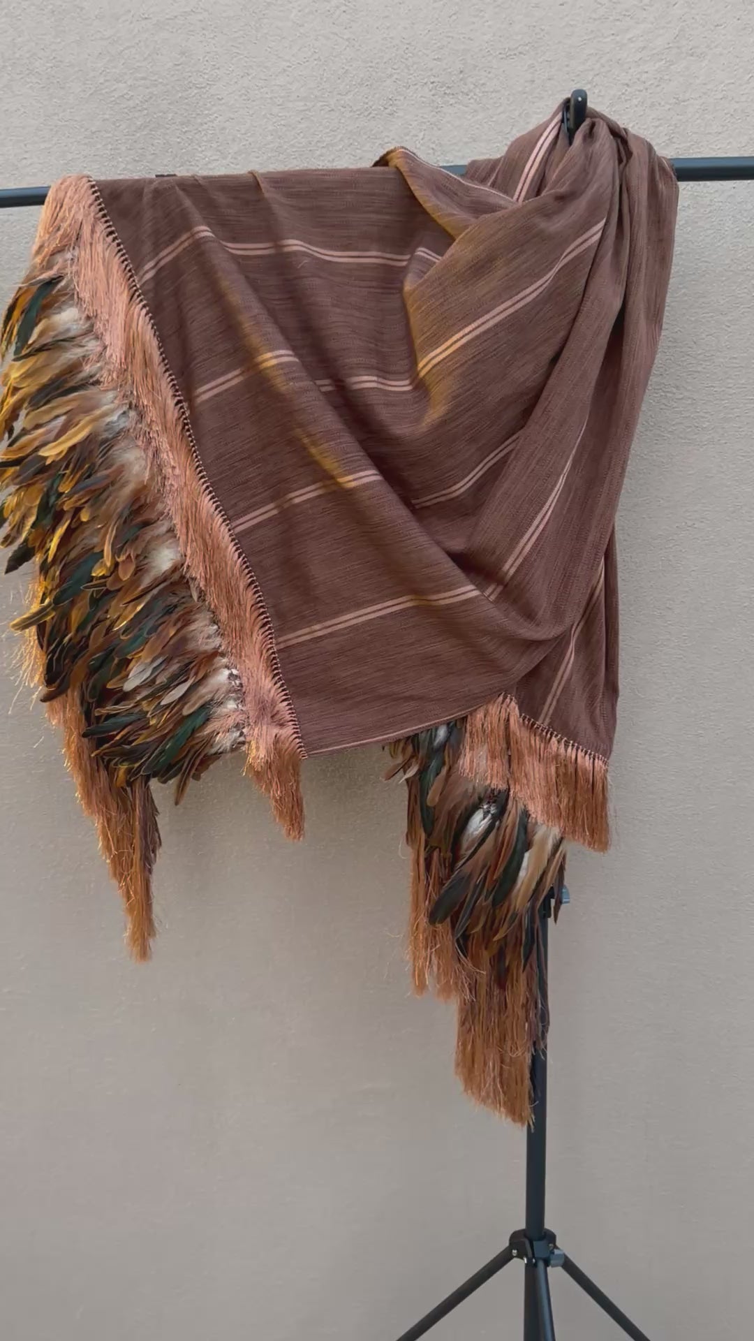 One of the most beautiful Purepecha rebozo’s with fringe from Michoacán, Mexico that I have ever seen. The combination is spectacular. These come from a Purepecha artisan from Michoacan. This is a traditional style of rebozo that has been produced for many years. It is 100% cotton with rayon and with silk fringe and feathers. This is woven on a backstop loom and takes about a month to make. The fringe on each end is called ‘flowers’. All of these Purepecha Rebozo’s measure 2.5 feet by 76 inches long. They are simply fabulous! This artisan is known for her amazing color combinations.