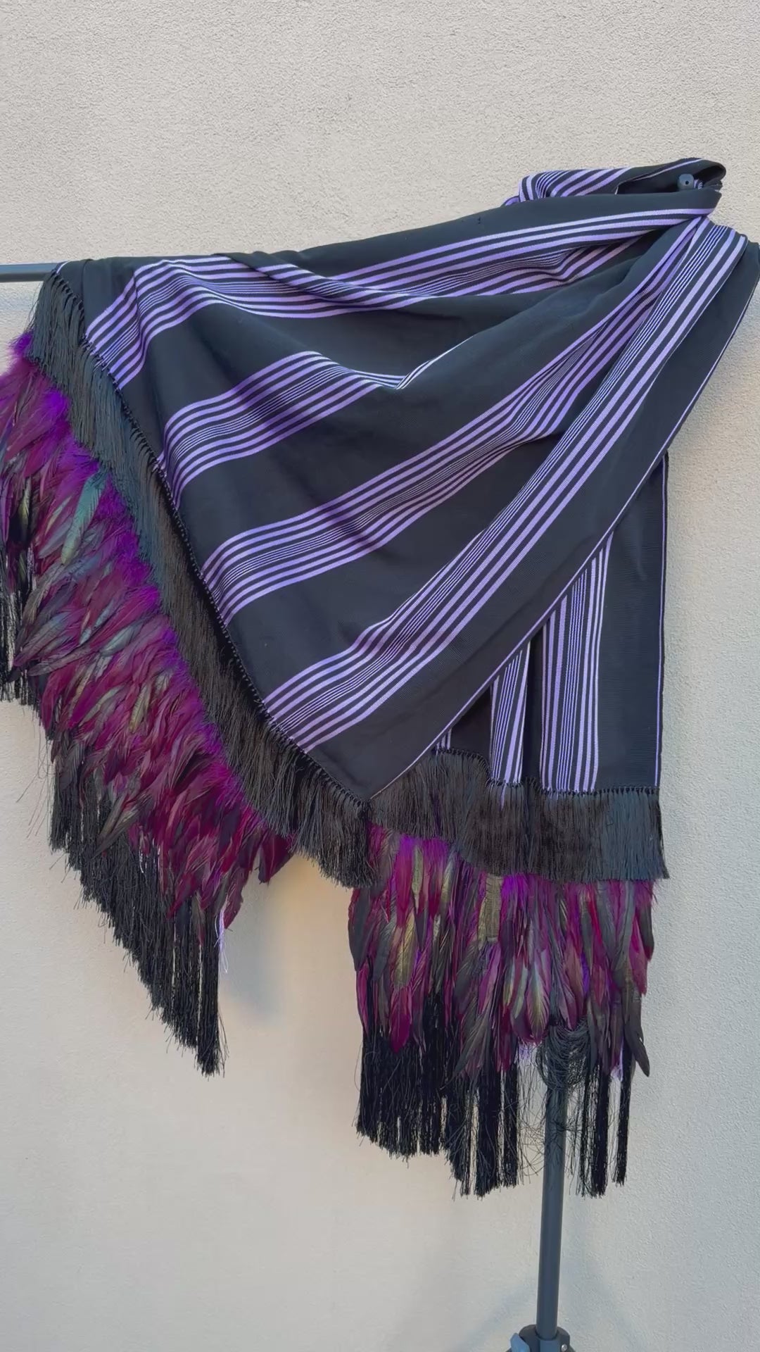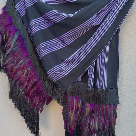 Purepecha rebozo with fringe and feathers purple