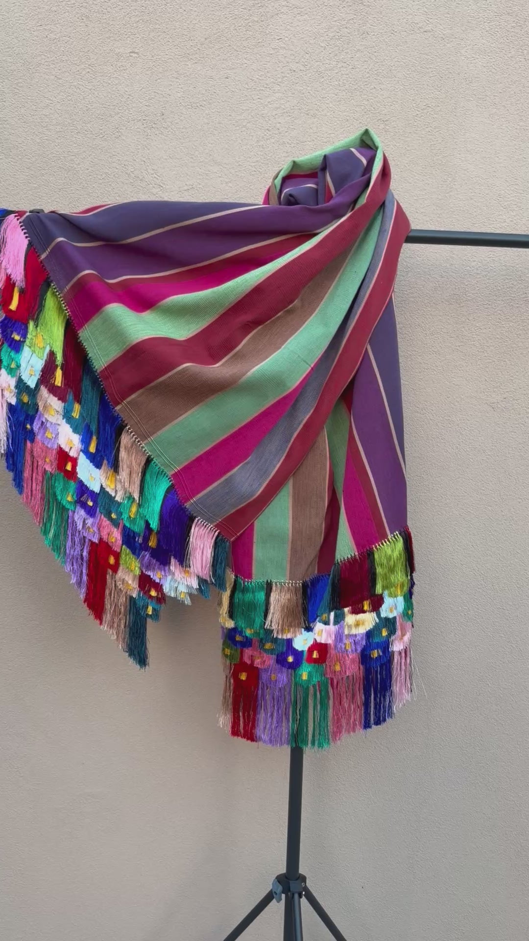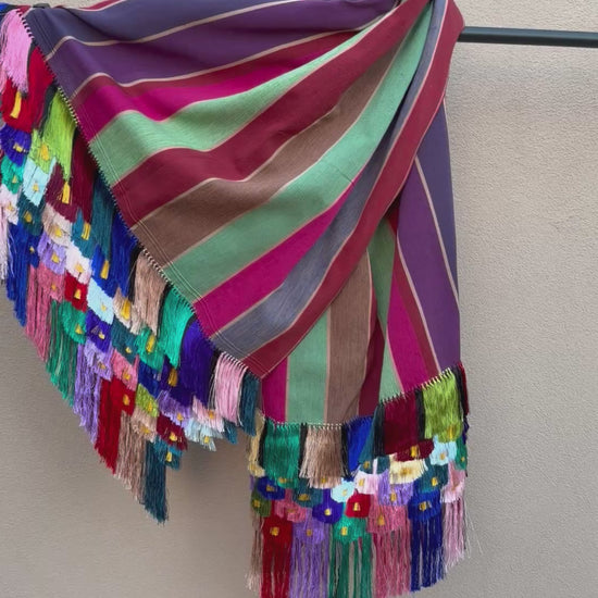 One of the most beautiful Purepecha rebozo’s with fringe from Michoacán, Mexico that I have ever seen. The combination is spectacular. These come from a Purepecha artisan from Michoacan. This is a traditional style of rebozo that has been produced for many years. It is 100% cotton with rayon and with silk fringe. This is woven on a backstop loom and takes about a month to make. The fringe on each end is called ‘flowers’. All of these Purepecha Rebozo’s measure 2.5 feet by 76 inches long. They are simply fabulous! This artisan is known for her amazing color combinations.