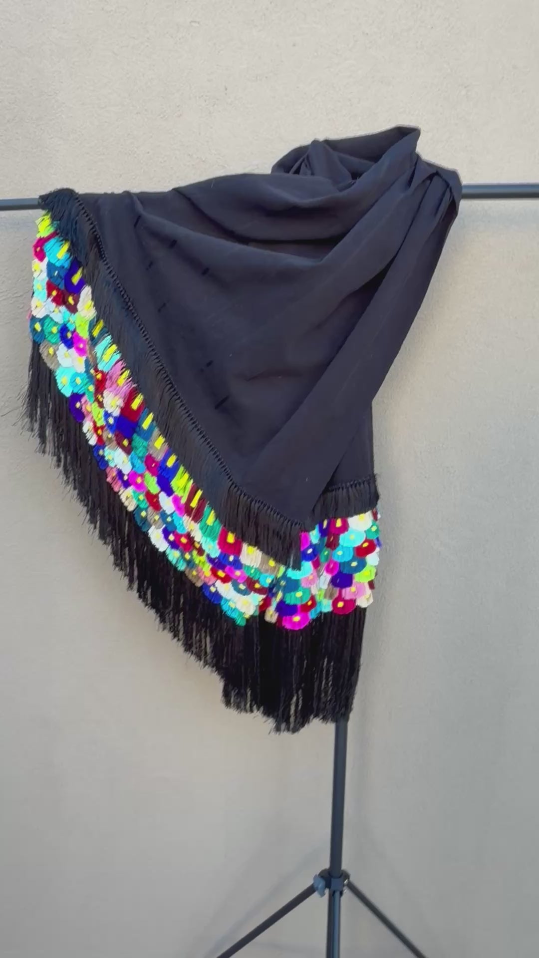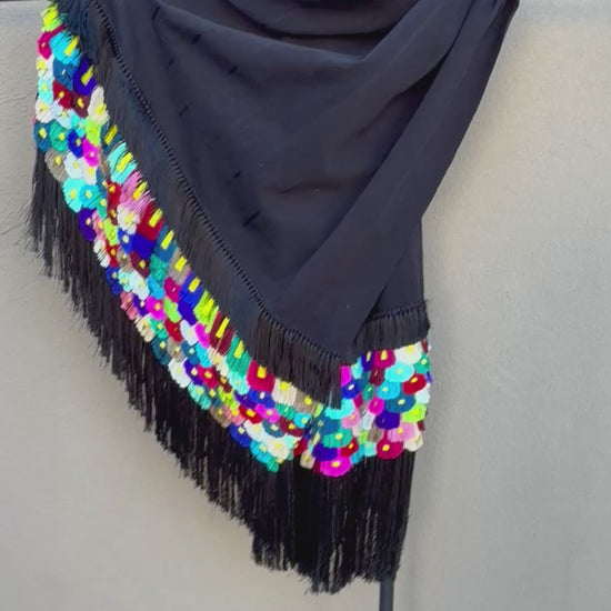 Black multi color Purepecha rebozo with fringe